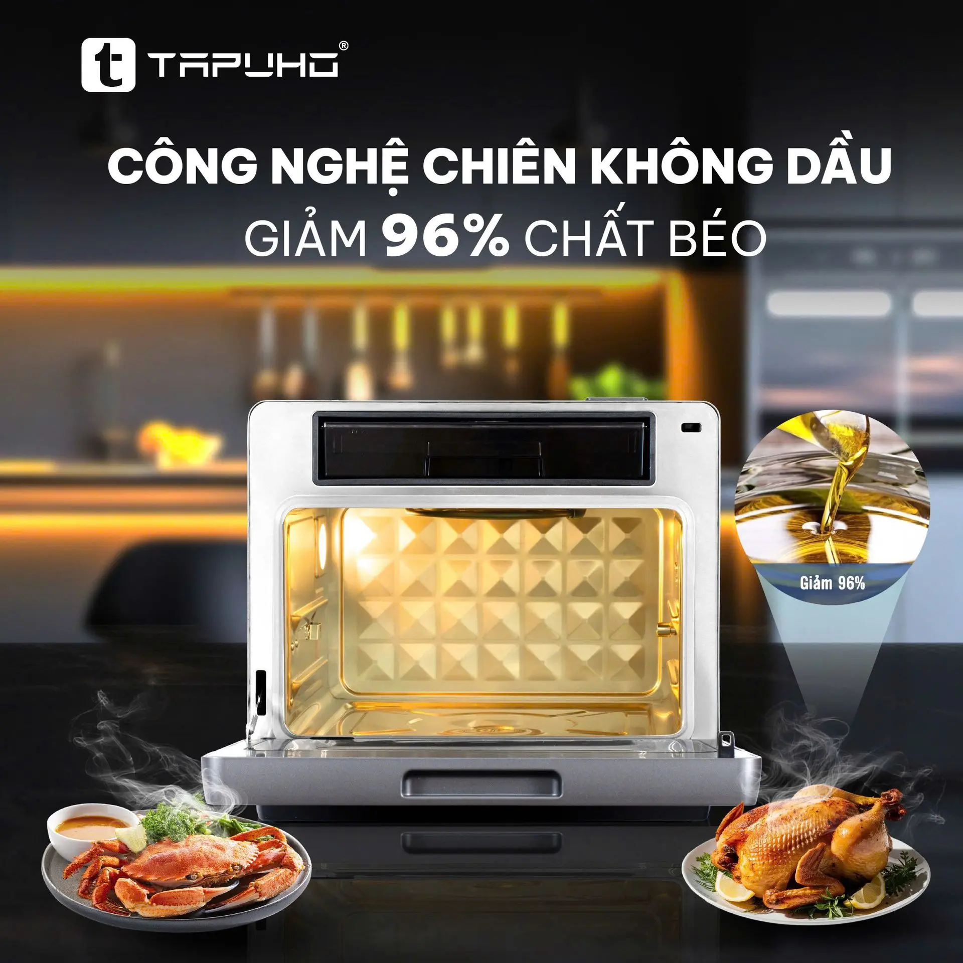 TAPUHO TMC20 PrimeAI sử dụng công nghệ khí nóng đối lưu, giúp món chiên vàng giòn hấp dẫn mà gần như không cần dùng dầu mỡ, giảm đáng kể lượng chất béo nạp vào cơ thể nhưng vẫn đảm bảo hương vị.