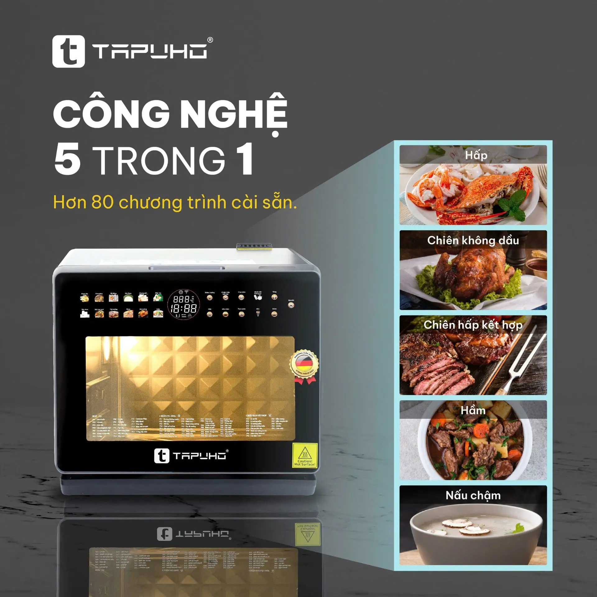 Máy nấu ăn đa năng TAPUHO tích hợp nhiều chế độ nấu (chiên - nướng - hấp - hầm - nấu chậm) trong một thiết bị. Người dùng có thể dễ dàng thực hiện các bước như hấp chín nguyên liệu, hầm mềm thịt hay hấp pate mà không cần chuyển sang nhiều dụng cụ bếp khác nhau, giúp quy trình nấu ăn gọn gàng và tiện lợi hơn.