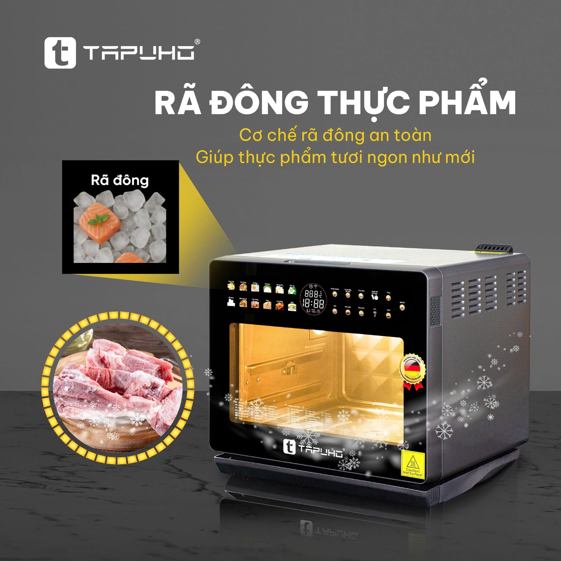 Rã đông bằng máy nấu ăn đa năng TAPUHO giúp thực phẩm mềm đều từ trong ra ngoài, không chín cạnh hay nhũn bề mặt như nước nóng hoặc lò vi sóng.