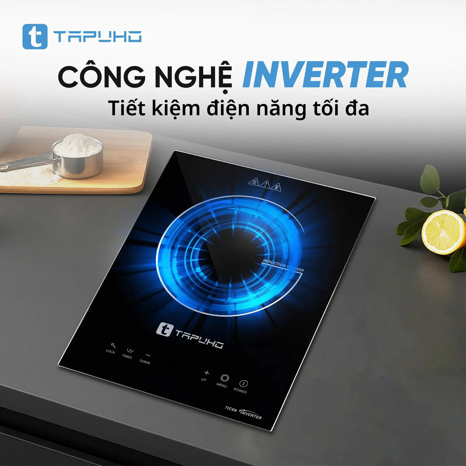 TAPUHO TIC99 sử dụng công nghệ biến tần INVERTER – một bước tiến trong công nghệ tiết kiệm điện cho bếp từ. Khi cần đun nấu ở mức nhiệt nhỏ, như giữ ấm, ninh, hầm hay nấu cháo, bếp không tắt bật liên tục mà duy trì dòng điện ổn định ở mức thấp. Điều này giúp giảm hao phí năng lượng, nâng cao tuổi thọ linh kiện và tránh tiếng ồn nổ tạch thường thấy ở các dòng bếp thường.