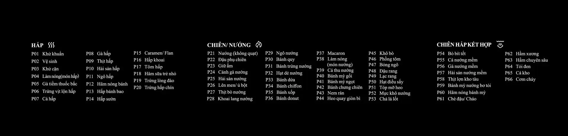 11. Tổng chức năng của bảng điều khiển chính và menu thực đơn: 82 chức năng (nồi 16 là 13 + 52 = 65 chức năng)