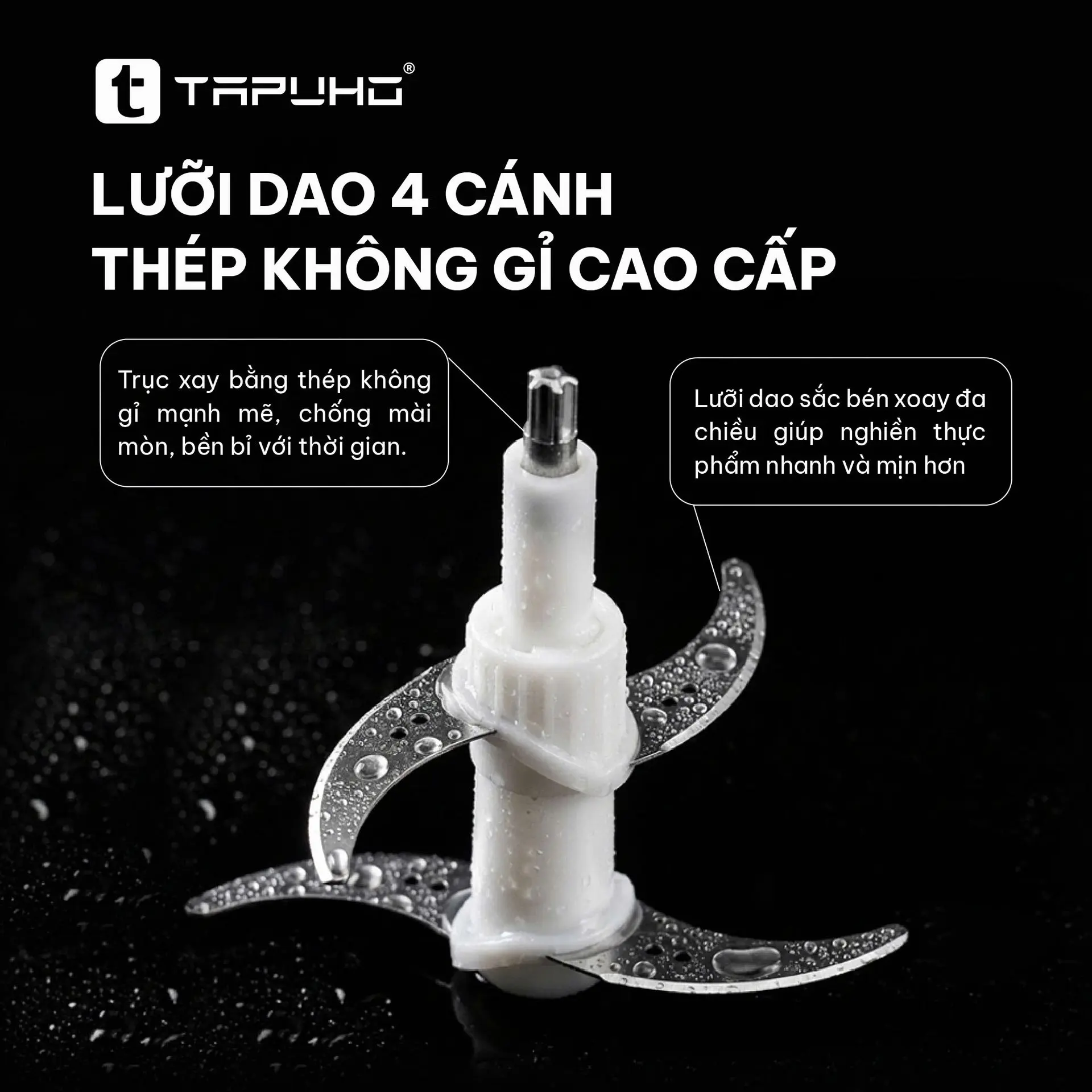 Lưỡi dao của TAPUHO TFG500 được làm từ thép không gỉ cao cấp, thiết kế 4 cánh xoắn kép giúp: