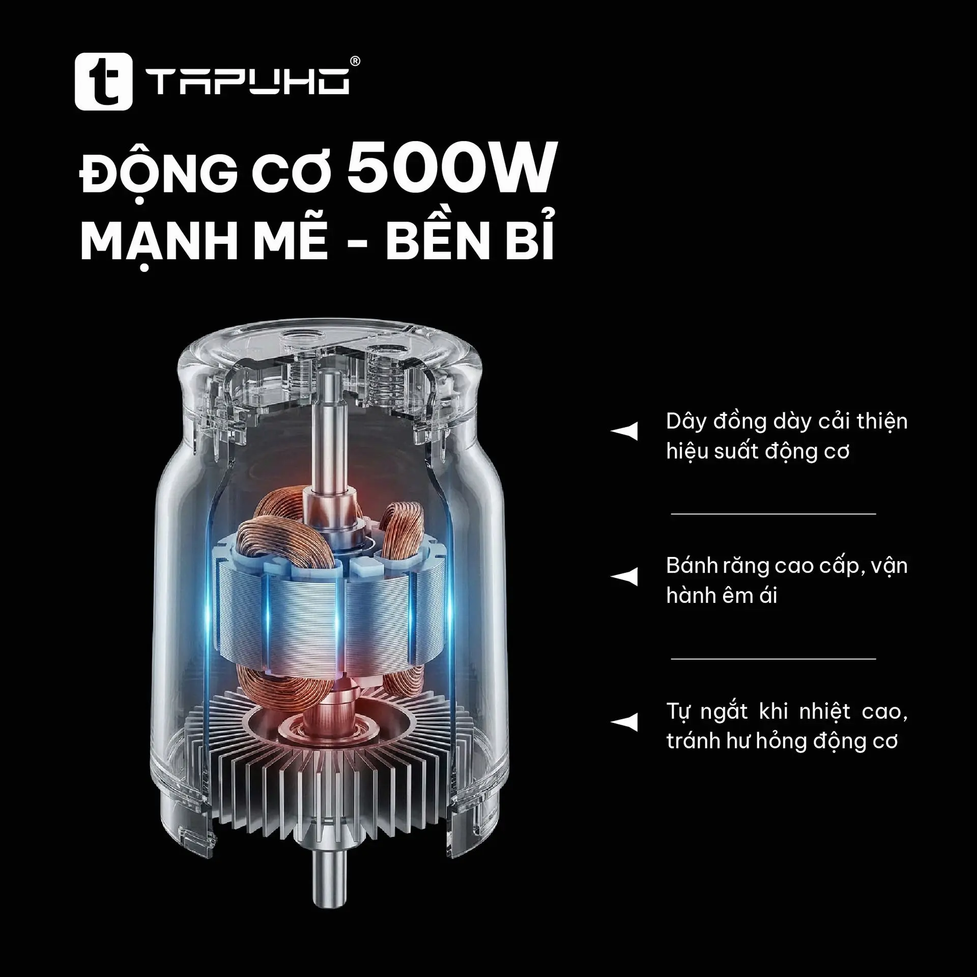 ✅ Động cơ đồng nguyên chất 500W – bền hơn, khỏe hơn