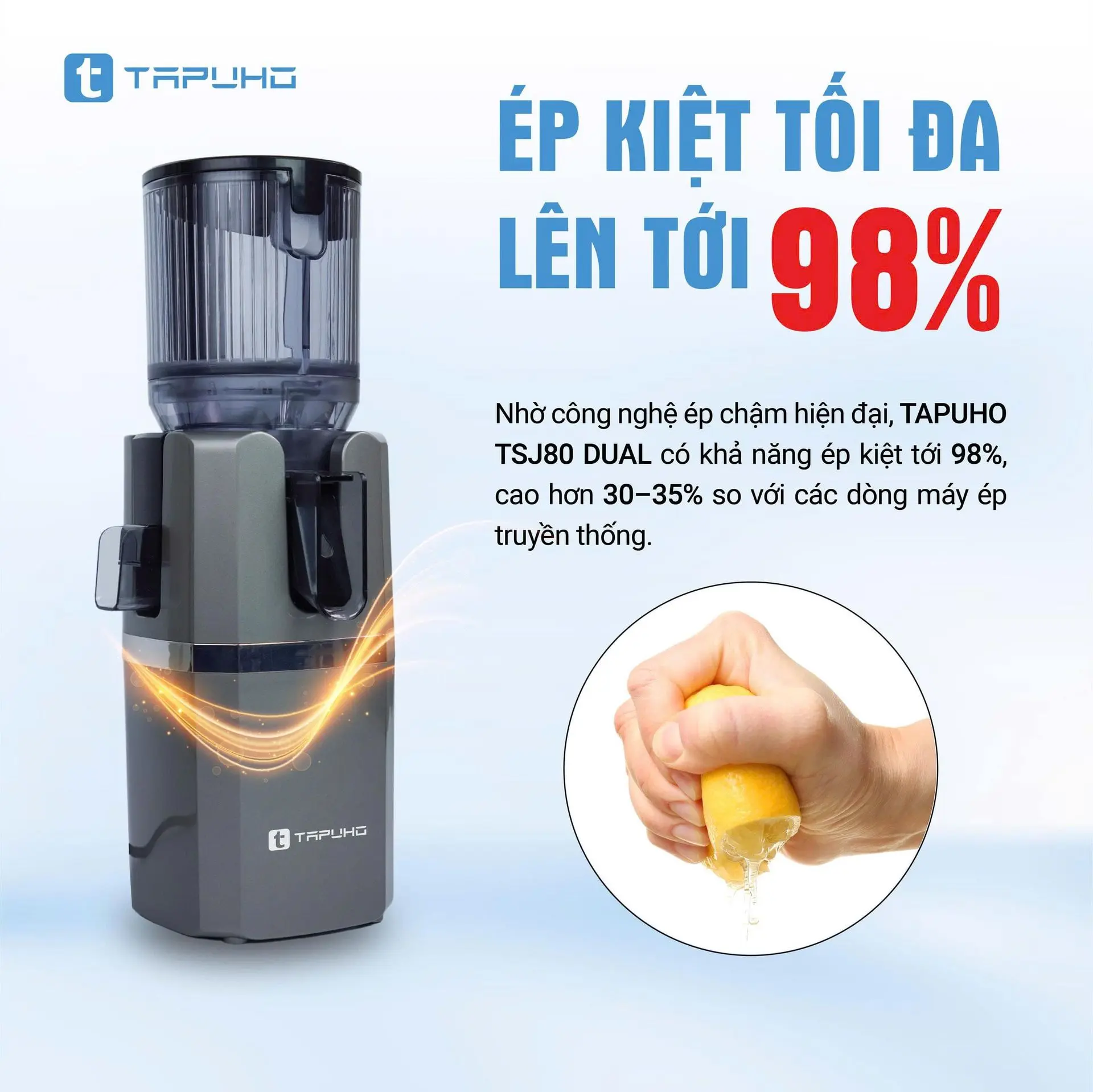 Nhờ công nghệ ép chậm hiện đại, TAPUHO TSJ80 DUAL có khả năng ép kiệt tới 98%, cao hơn 30–35% so với các dòng máy ép truyền thống. Điều này giúp bạn thu được nhiều nước ép hơn, tận dụng tối đa lượng trái cây, rau củ mà không bỏ phí phần bã còn nhiều dưỡng chất.